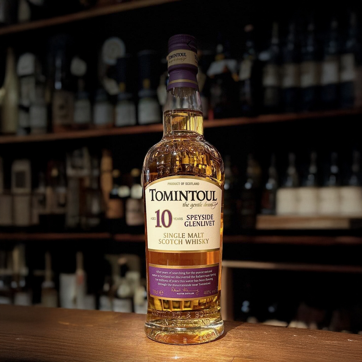 The Tomintoul Single Malt Whisky is a testament to our Master distiller, Robert Flemming, whose family has been making whisky in the Speyside Glenlivet region for four generations. Inspired by tradition, he has produced a single mant of unique quality, which is invitingly smooth and mellow.